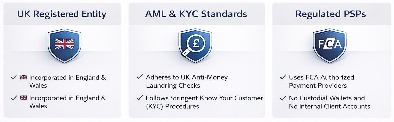 All customer payments are processed through independent, FCA-authorised Payment Service Providers (PSPs), including Stripe. Customer funds are received and safeguarded within the regulated PSP environment in accordance with applicable payment services regulations.